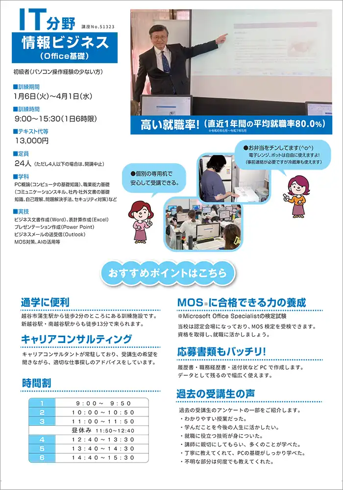 メールや資料作成の基礎から、MOS資格取得、そして就職成功まで、一貫した支援を提供します